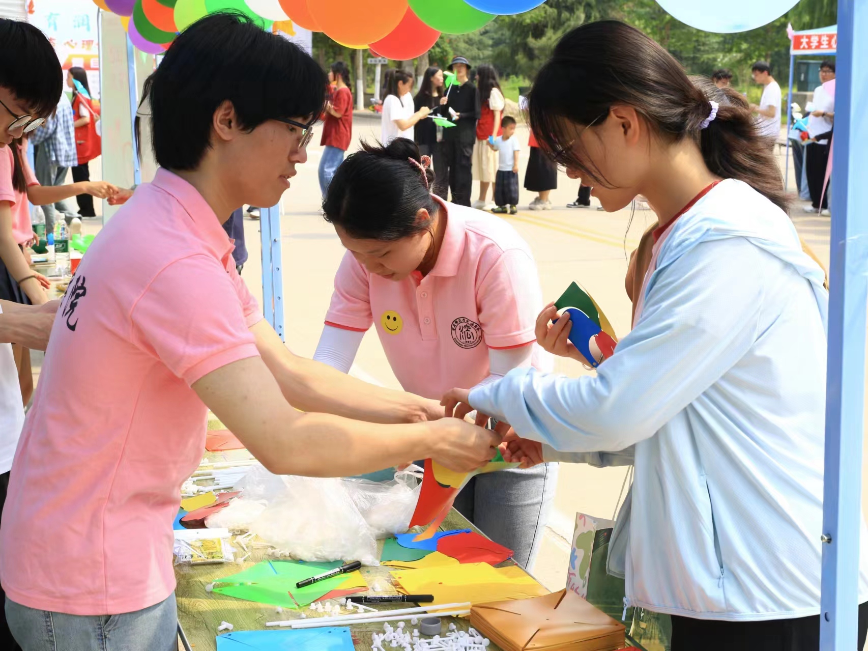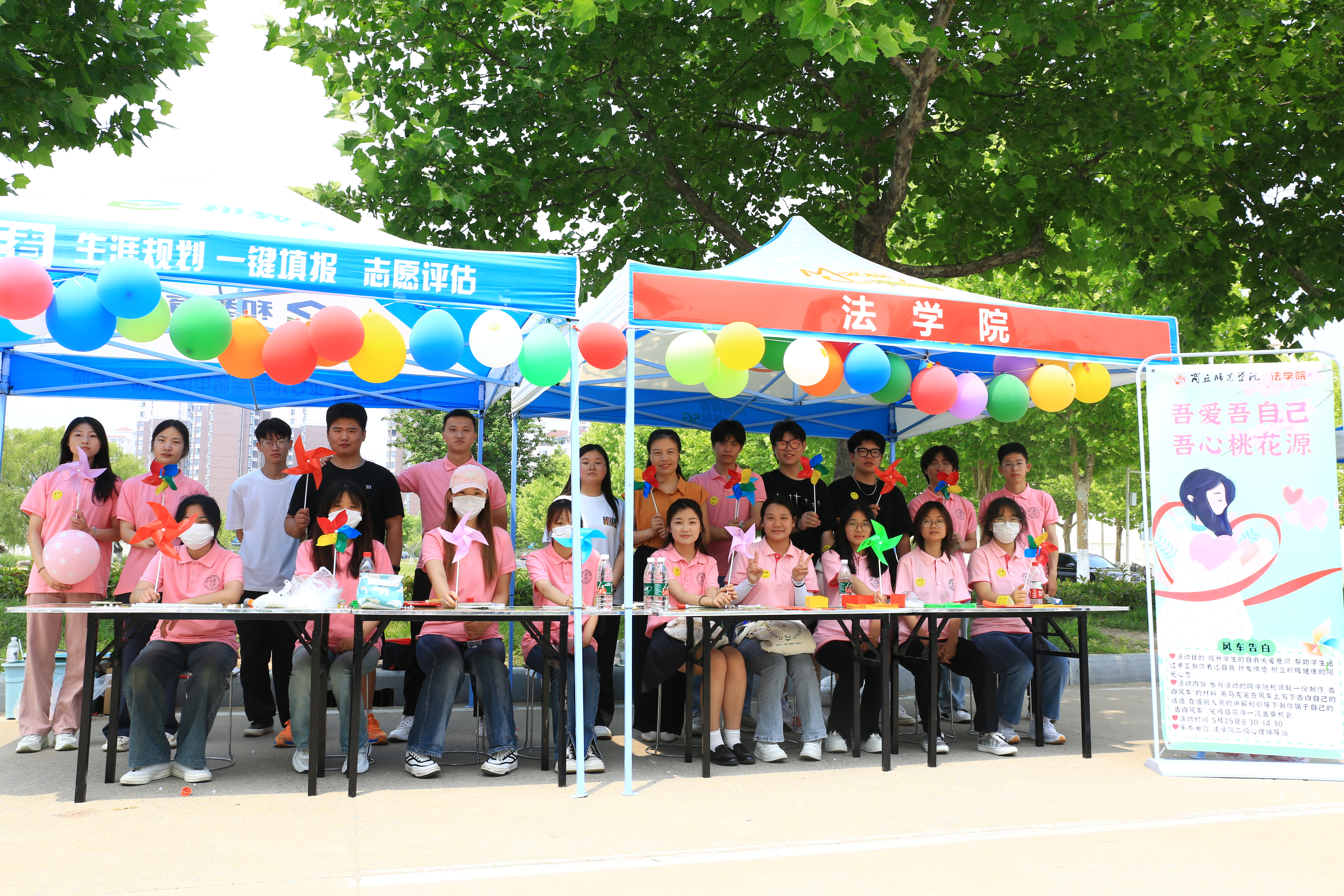 活动现场,在志愿者的现场讲解和引导下,活动参与者随机领取一份制作“告白风车”材料,用马克笔在风车上写下告白自己的话语,制作属于自己的“告白风车”,旨在提升同学们自我关爱意识,树立积极健康的阳光心态。