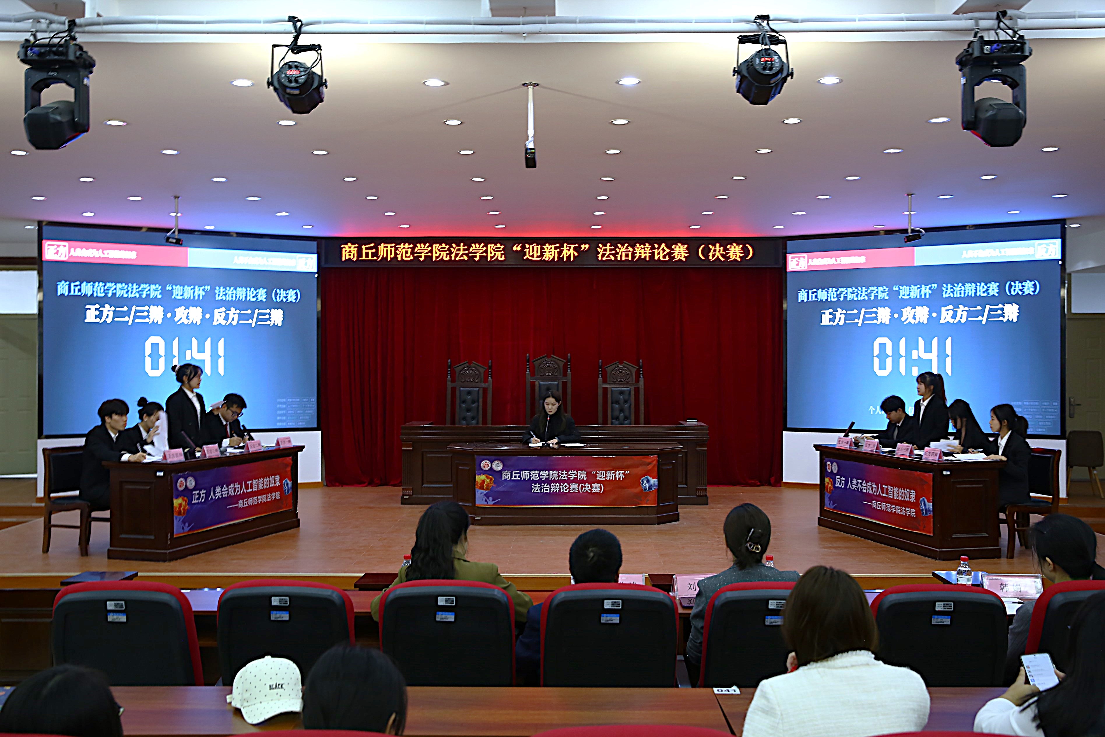 决赛围绕“法治”这一核心主题,以“人类是否会成为人工智能的奴隶”为辩题展开激烈讨论。共有两支队伍参赛,选手们经过充分准备,以饱满的精神状态进入比赛现场。辩论过程中,双方辩手引经据典、旁征博引,运用丰富的法学理论、缜密的法律逻辑、流畅的表达能力,充分展示了他们对法治知识的深入思考和独特见解。整场比赛高潮迭起、扣人心弦,赢得在场评委和观众的阵阵掌声和喝彩。整场辩论不仅展示了辩论队成员的辩论能力、团队协作能力和应变能力,还体现了当代青年在法治问题上的敏锐观察和深入思考。