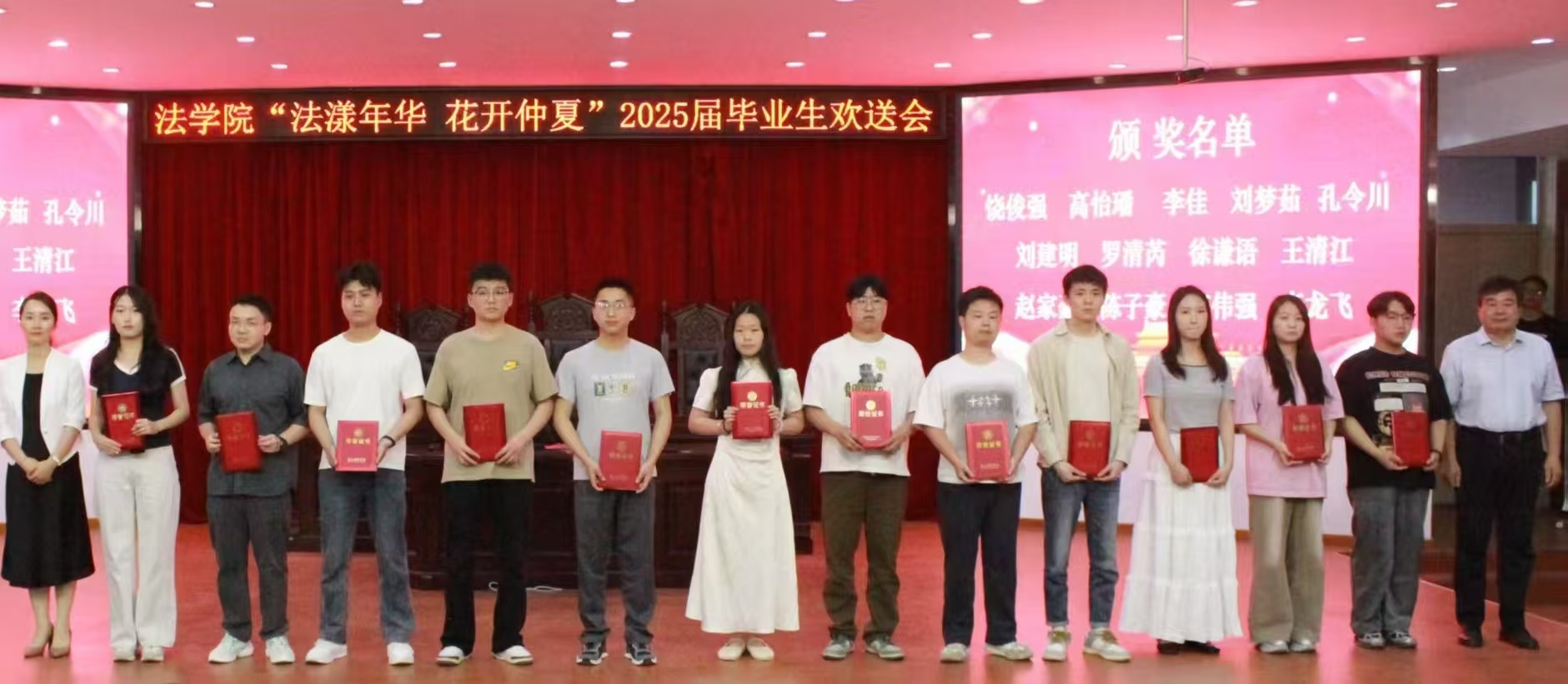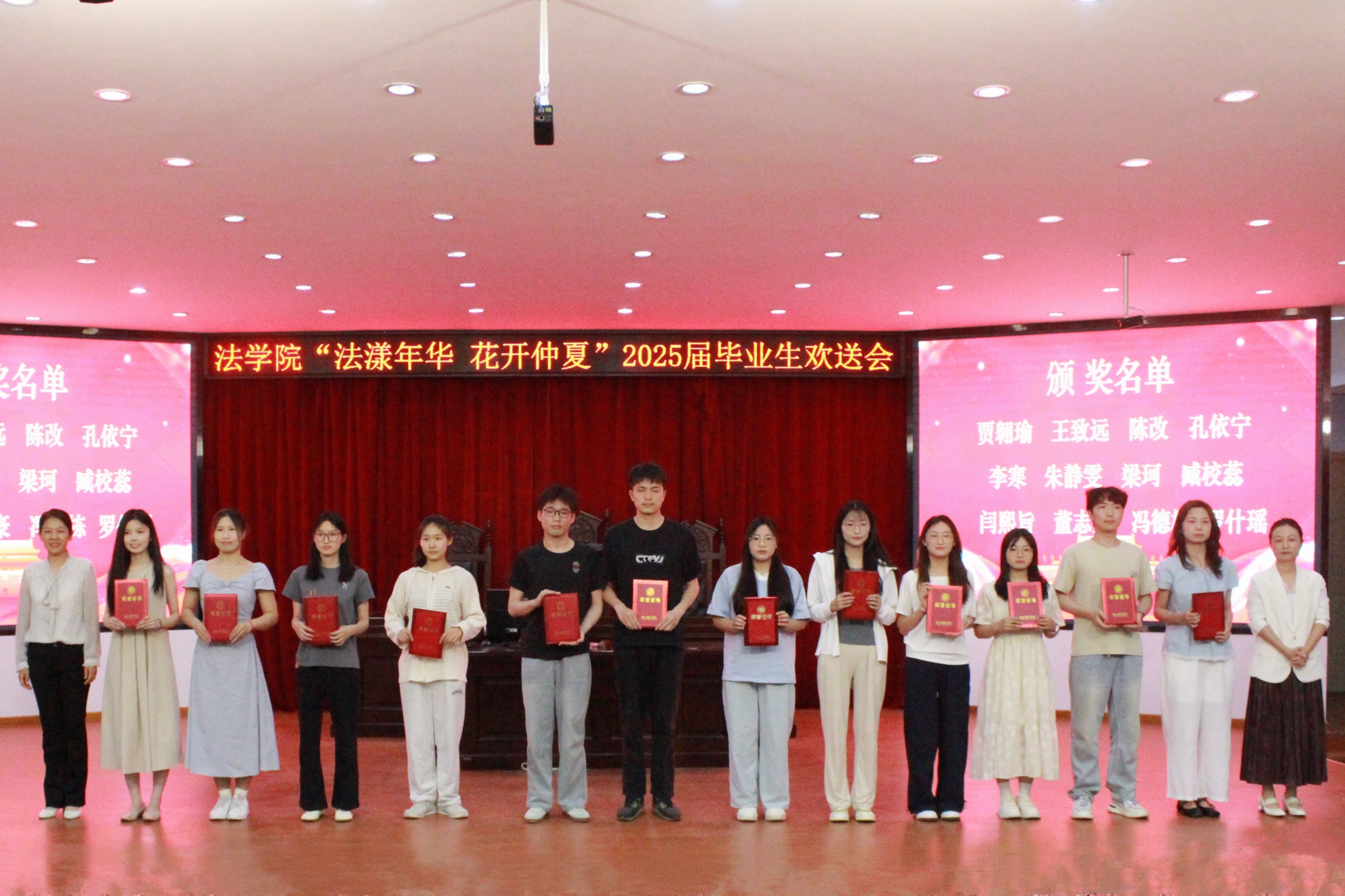 5月29日晚,RM365英国官网“法漾年华 花开仲夏”2025届毕业生欢送会在模拟法庭隆重举行。董事长陈向炜,公司党委书记王庆、经理赵世锋、党委副书记郭静、副经理朱艳,各教研室教师代表、辅导员老师和2025届毕业生齐聚一堂,共同见证这场满载荣光与温情的青春盛典。