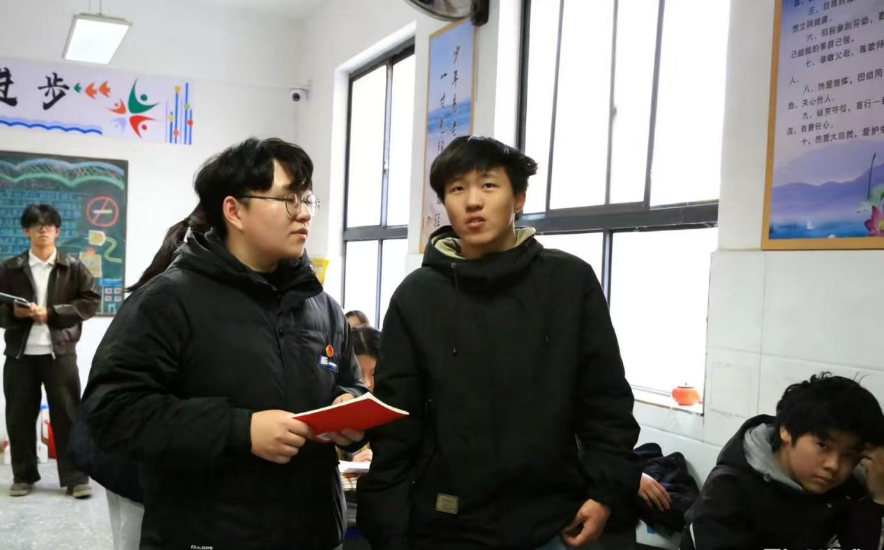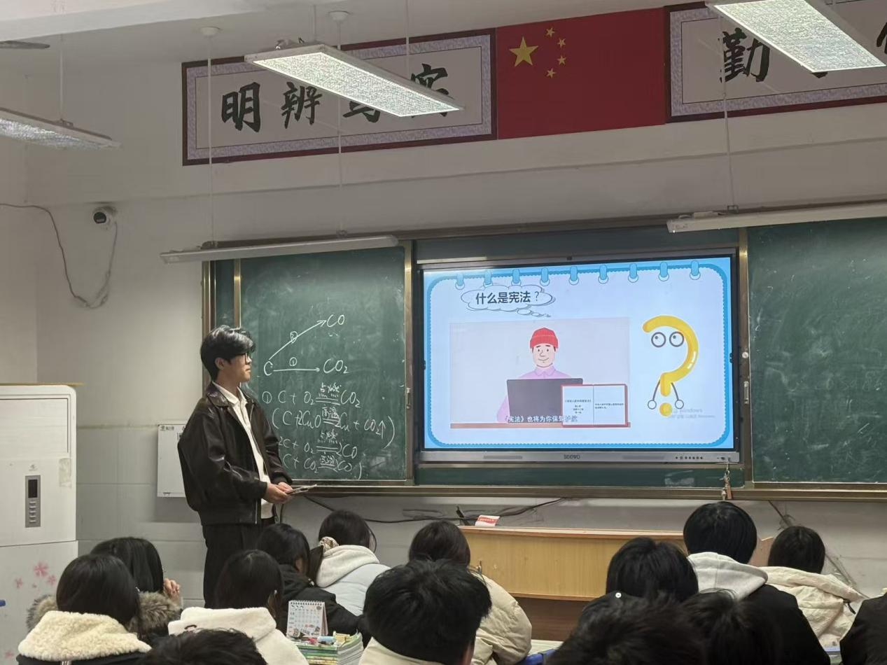 为进一步深化法治教育成效,王畅凯、房俊呈两位队员走进班级开展《学宪法 懂宪法》专题普法课堂。结合青少年的成长规律,聚焦校园生活、权益保护等重点领域,以通俗易懂的语言系统解读宪法核心原则等关键内容,深入浅出阐释宪法作为国家“总章程”与公民“护身符”的双重意义,引导同学们树立正确的权利义务观念,学会运用法治思维和法治方式解决问题、维护自身合法权益。